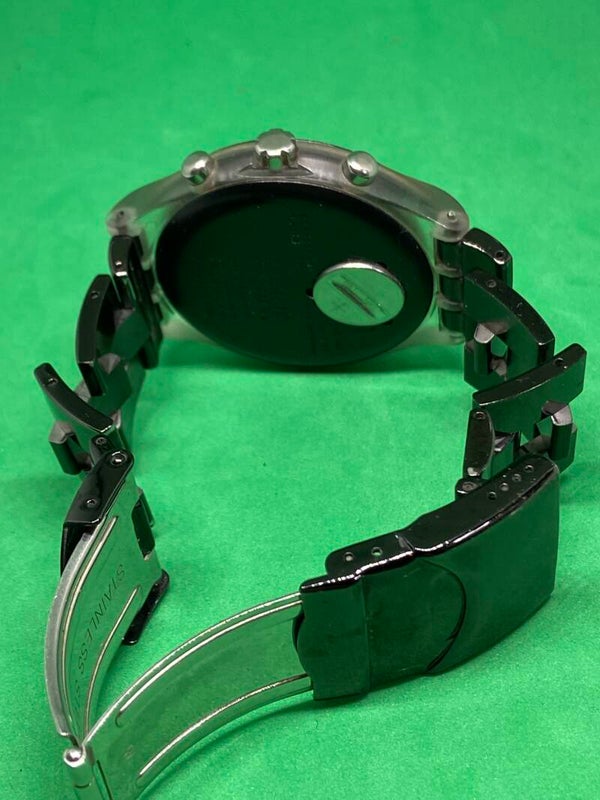 Doorzichtige plastic behuizing met een zwarte aluminium armband. Vaste zwarte aluminium bezel. Zwarte wijzerplaat met lichtgevende wijzers en kristallen uurmarkeringen. Minuutmarkeringen rond de buitenrand. Dial Type: Analoog. Lichtgevende jamds. Datumweergave verschijnt tussen de posities 8 en 9 uur. Chronograaf - drie sub-wijzerplaten die weergeven: 60 seconden, 60 minuten en 1/10e van een seconde. Quartz uurwerk. Krasbestendig mineraal kristal. Trek/duw kroon. Stevige koffer terug. Kast diameter: 43,1 mm. Dikte kast: 12,8 mm. Ronde kastvorm. Band breedte: 21 mm. Vouw de sluiting om met een veiligheidssluiting. Waterbestendig op 30 meter / 100 voet. Functies: chronograaf, datum, uur, minuut, seconde. Casual horloge stijl. Horlogelabel: Swiss Made. Swatch Volbloed Nachtchronograaf Herenhorloge SVCK4035AG.