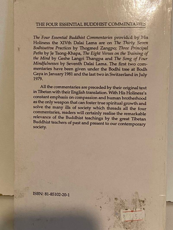 "The Four Essential Buddhist Teachings" is een spiritueel werk van de veertiende Dalai Lama, Tenzin Gyatso, waarin hij de fundamenten van het Boeddhisme bespreekt en uitlegt. Dit boek biedt een beknopte, toegankelijke uitleg van vier centrale concepten binnen de Boeddhistische filosofie die essentieel zijn voor het begrijpen van de Boeddhistische leer en het toepassen ervan in het dagelijks leven. De Dalai Lama presenteert deze vier pijlers als cruciale elementen voor zowel spirituele groei als morele ontwikkeling.