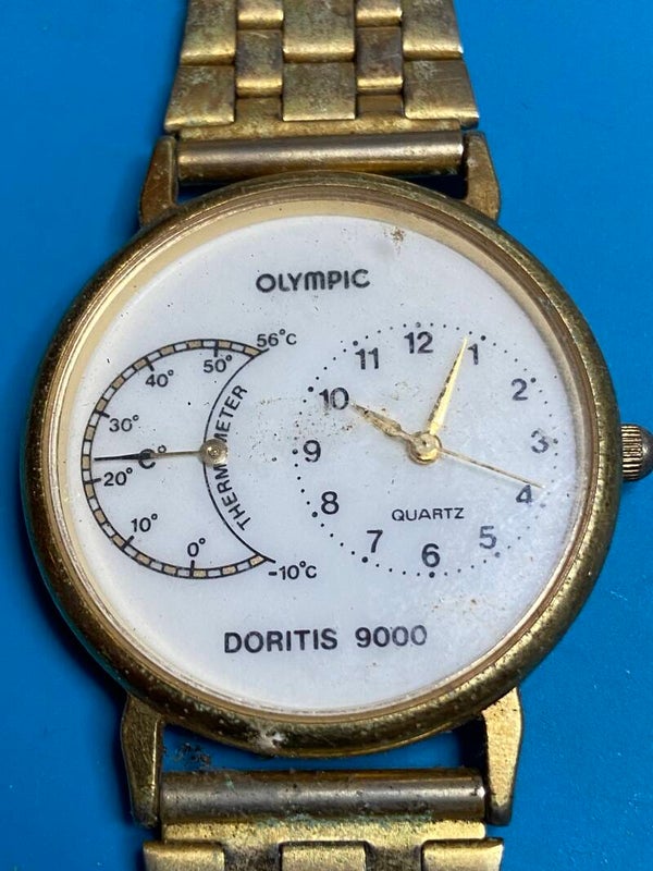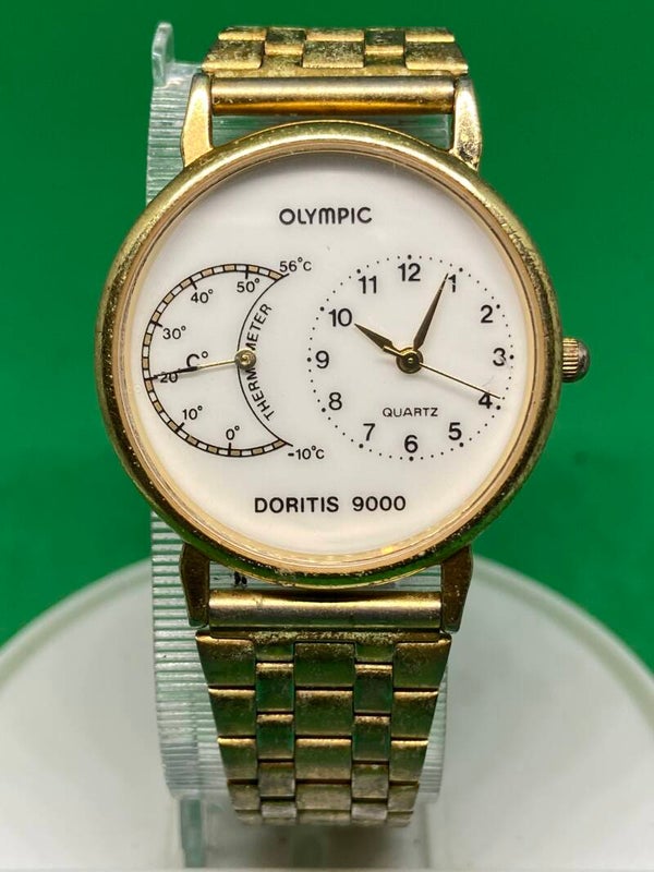 Het leuke van deze gelimiteerde uitvoering van de olympic Doritis 9000 herenpolshorloge uit 1991 is dat deze ook voorzien is van een Temperatuurmeter.