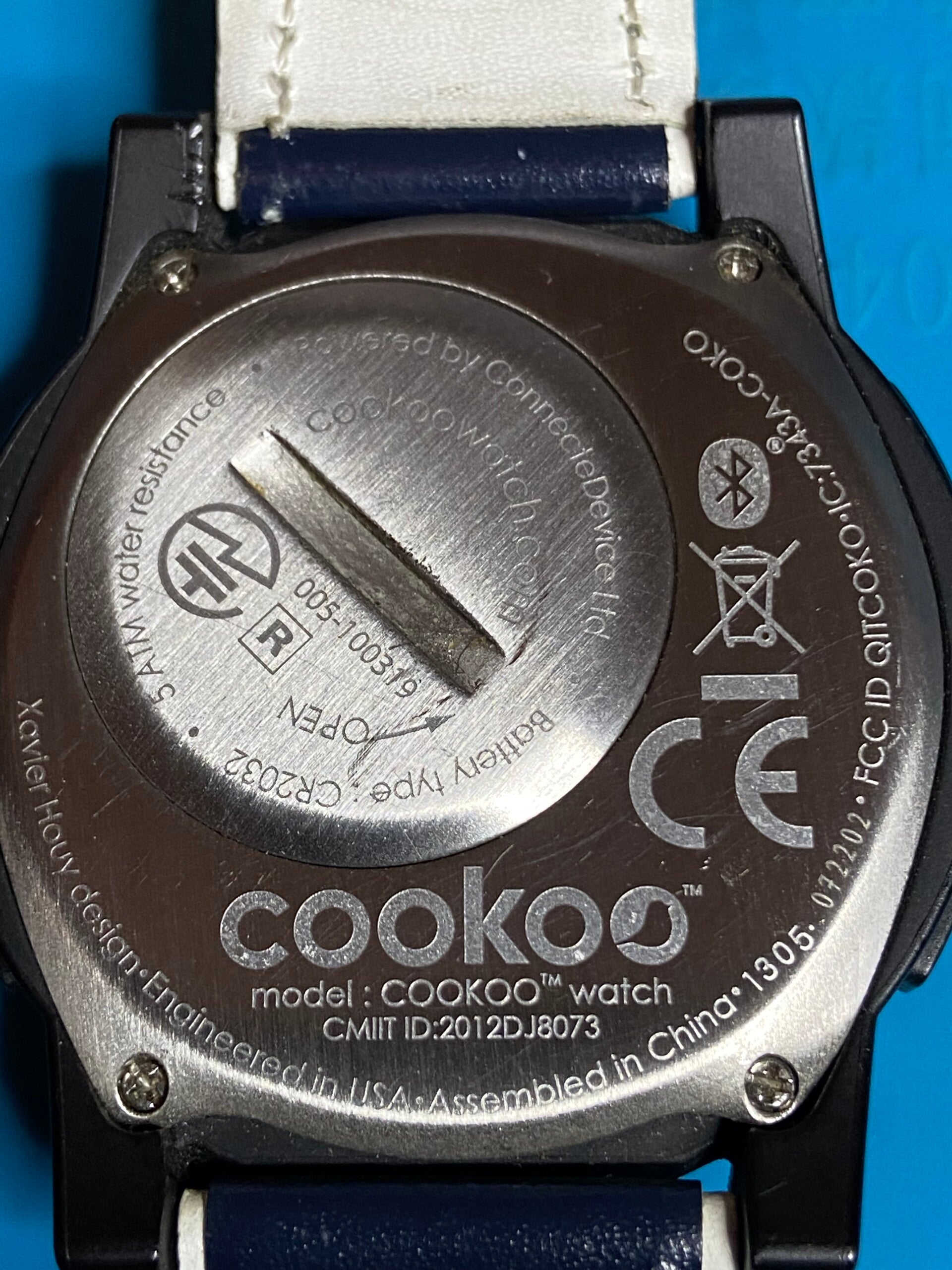Je hoeft de CookooWatch niet op te laden, in tegenstelling tot andere voorbeelden die verbinding maken via de Bluetooth-interface. Het apparaat heeft 2 batterijen die 1 jaar energie kunnen leveren voor bluetooth-meldingen en 3 jaar voor analoge klok, en je kunt deze batterijen vinden bij elke horlogemaker of elektronicawinkel.